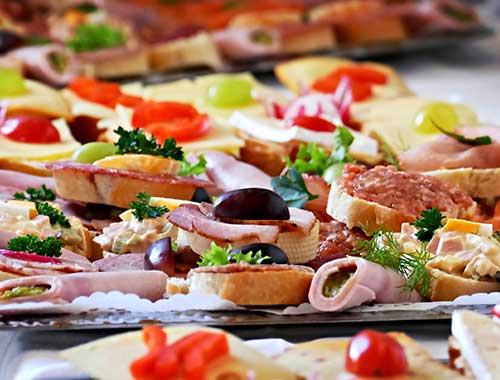 Hot Cajun Chicken breast, rolled sliced meats, selection of deluxe salads, hot jacket potatoes, Bretzel bakery bread, paper plates/knives/forks